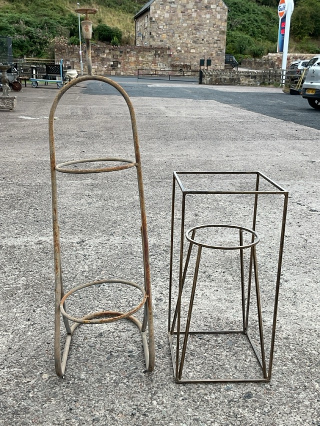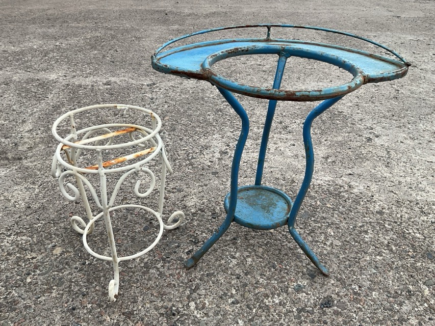Four miscellaneous plant pot stands - twin apertures with faux tap, plain square, scrolled single pot, and painted with apron shelf. (4)