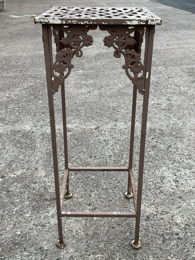 A square wrought iron plant stand with latticework panel to top on square supports with pad feet, having pierced decorative floral spandrels; and a circular stand with four waisted legs having pierced panel to top. (2)