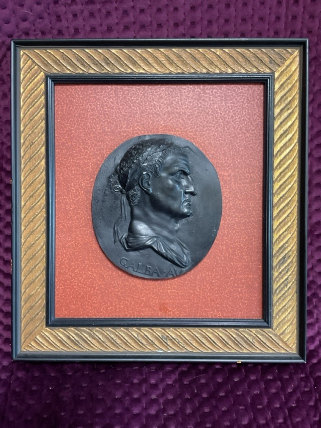 A pair of classical ebonised oval relief moulded plaques after the roman antique, Servius Galba and Augustus Divvas, mounted and in gilded gadrooned moulded frames. (11in x 12in) (2)