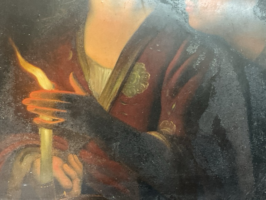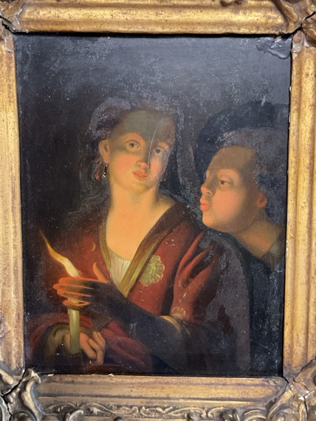 Nineteenth century European school after Godfried Schalcken, oil on copper, two figures at night with candleflame, undecipherable pencil inscription to verso, in fine gilt & gesso scrolled frame. (5.5in x 7.25in)