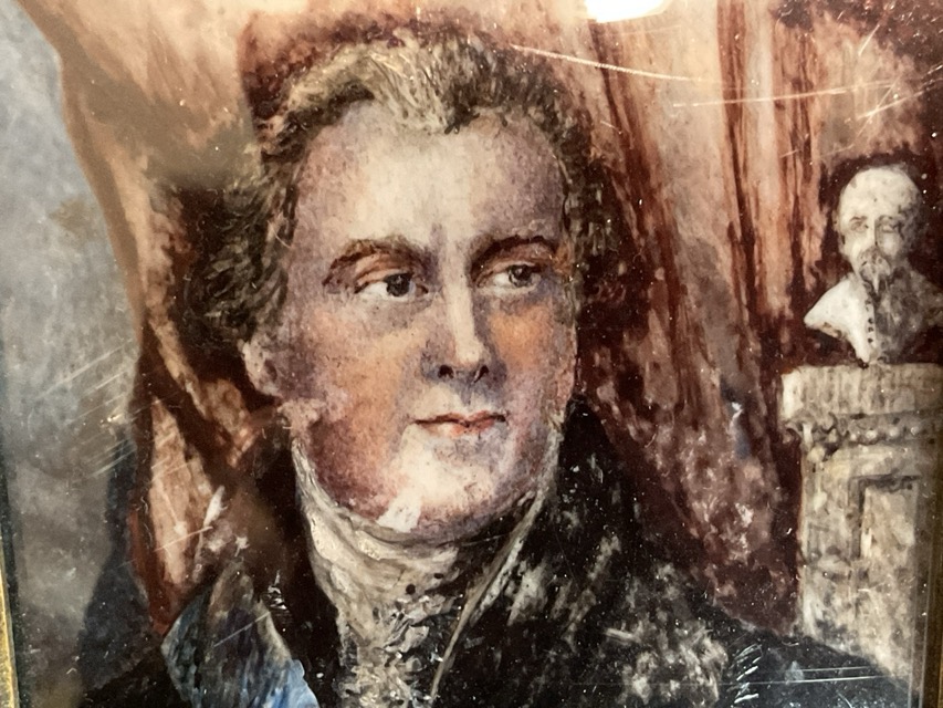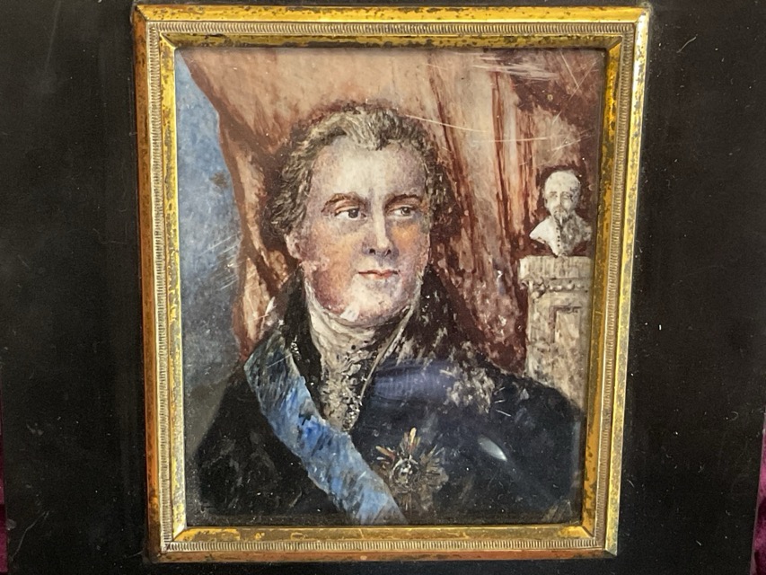 Miniature oil on panel, bust of a military gentleman with curtain behind, unsigned, in ebonised frame with floral gilt metal mount. (2.75in x 3.25in)