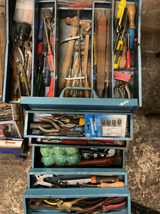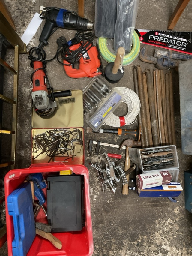 Miscellaneous tools - power drills, sanders, springs, clamps, tool boxes, hammers, alan keys, drill bits, chisels, screwdrivers, pliers, saws, files, etc. (A lot)