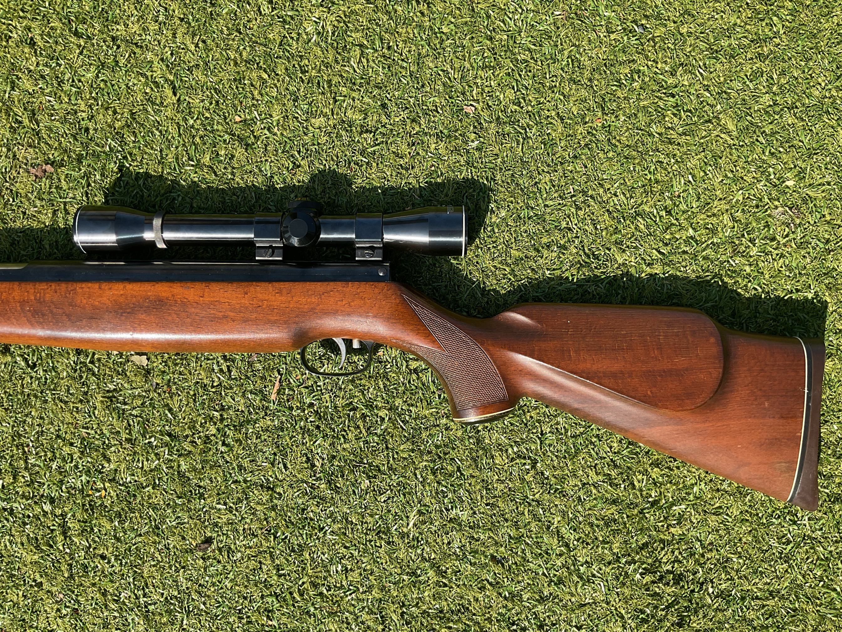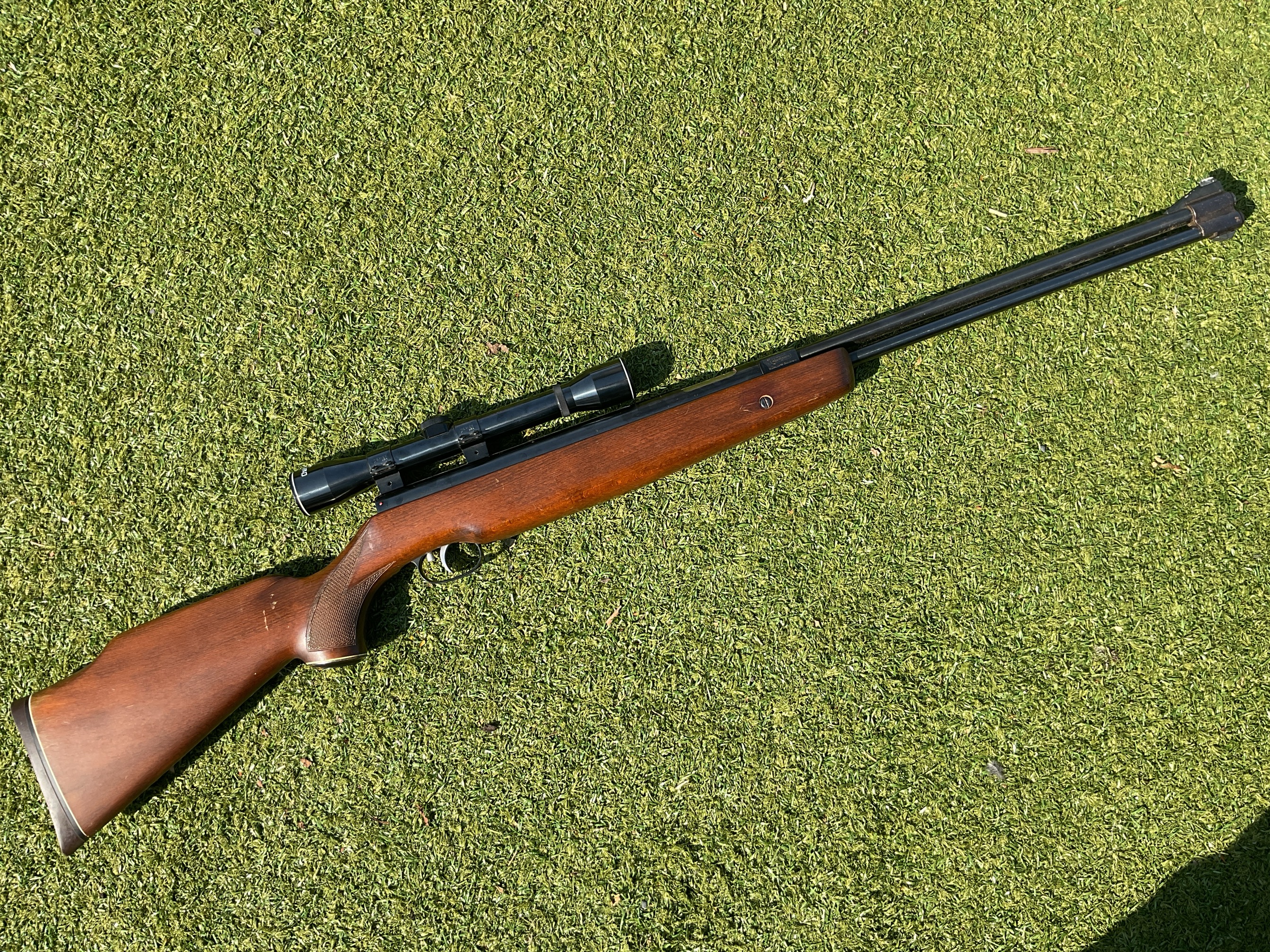 A German Weihraugh .22 air rifle - numbered 1022642, with pistol shaped beech stock, rubberised shoulder pad, lever action, Weaver challenger USA 4-power telescopic sights, etc. (44in)