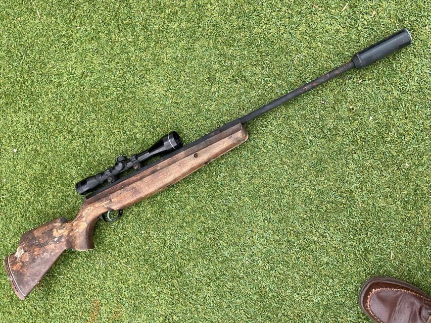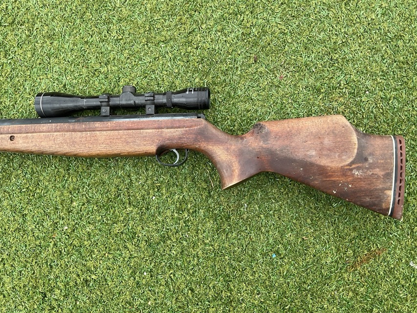 A Webley Tomahawk .22 air rifle with pistol shaped beech stock, sound moderator, rubberoid shoulder pad, Nikko Stirling 4x40 telescopic sights, etc. (A/F) (45.25in)