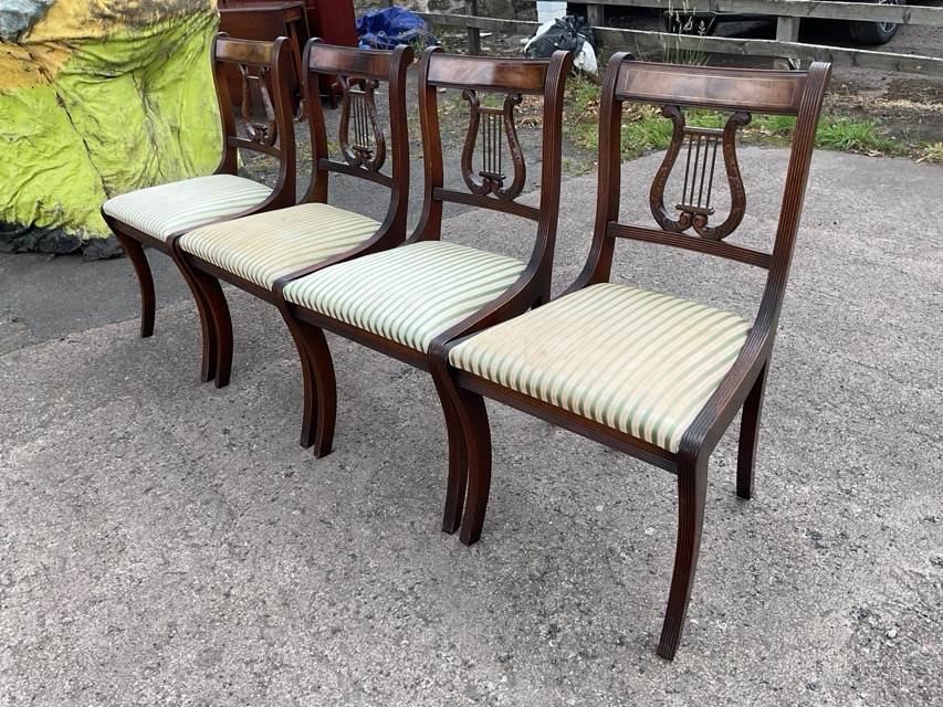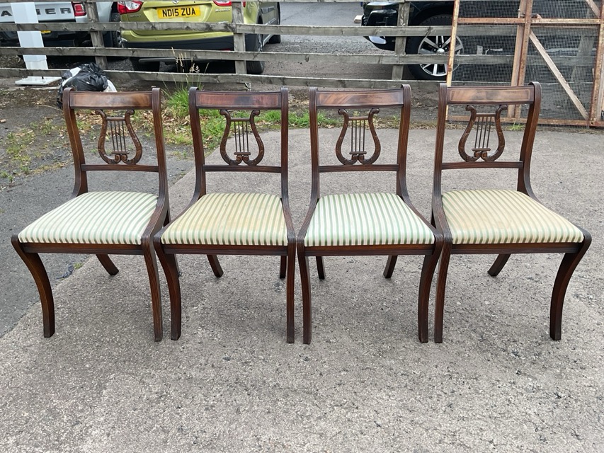 A set of four regency style mahogany dining chairs with boxwood strung backs and carved lyre splats on reeded supports, above drop-in upholstered seats raised on sabre legs. (4)
