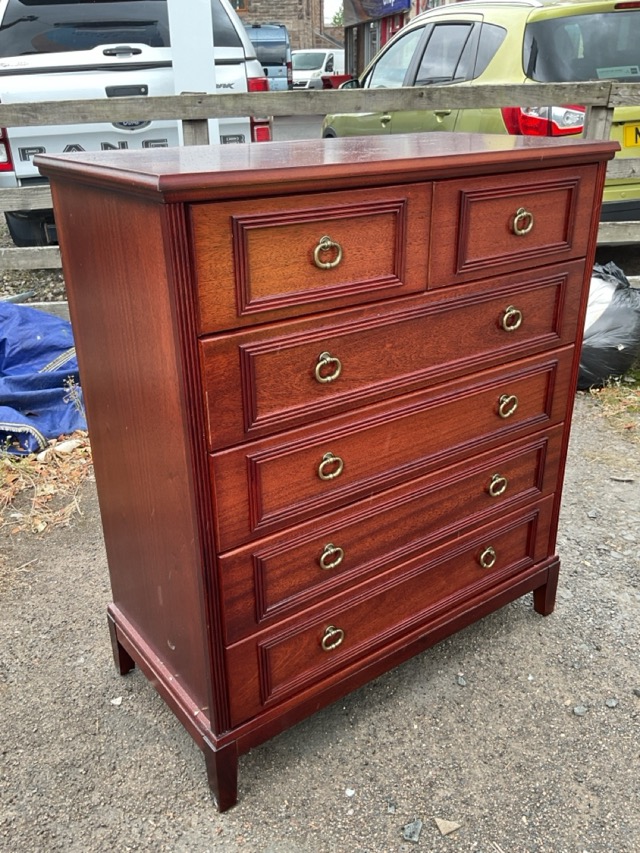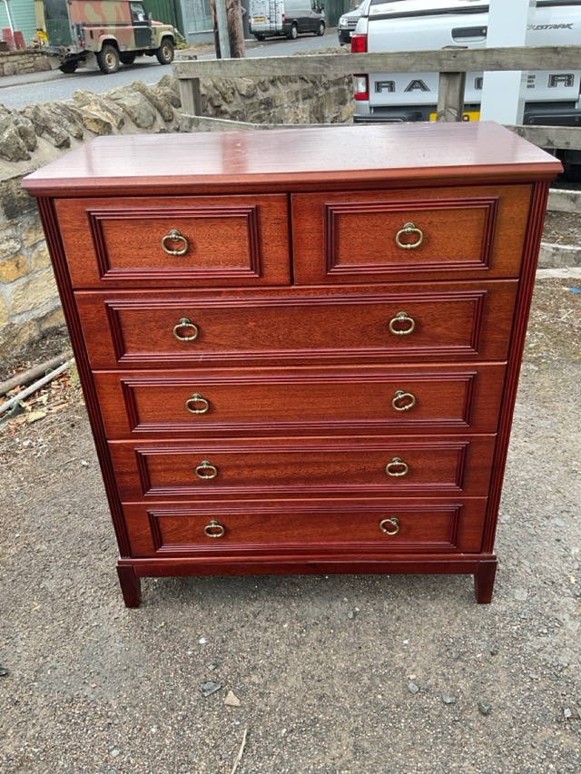 A mahogany chest of drawers with rectangular top above six brass ring handled drawers with reeded moulded panels, raised on square tapering legs. (37in x 19in x 43in)
