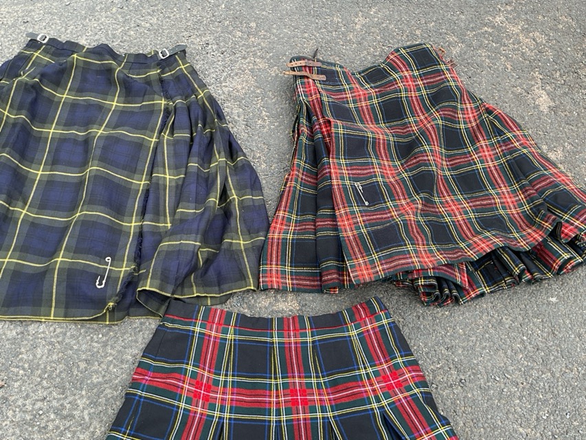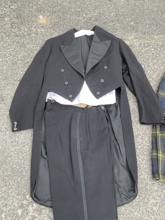 A white tie evening tailcoat and trousers with white satin double-breasted waistcoat; two Pringle tartan wool kilt skirts; and a dress kilt with leather strap fastenings. (4)