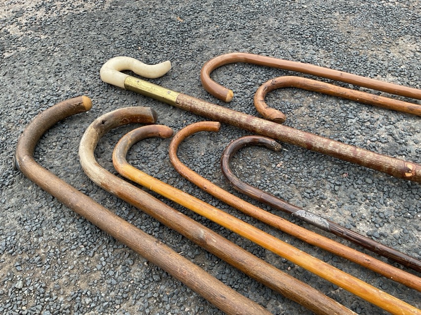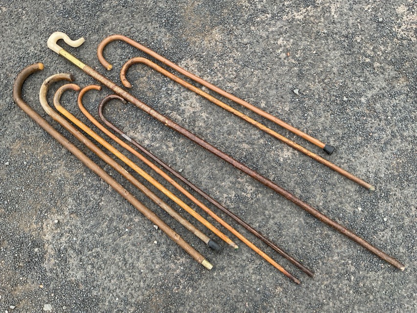 A horn shepherds crook with brass collar on a hazel shaft; a Swaine & Adeney Ltd bentwood walking stick with hallmarked silver thumbpiece; a bamboo walking cane with unmarked engraved silver collar; and five other walking canes. (8)