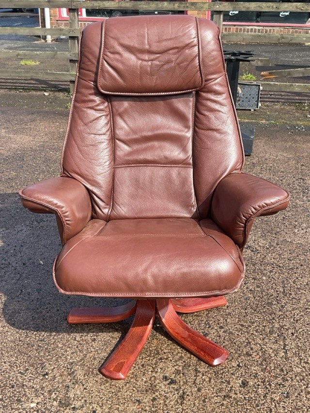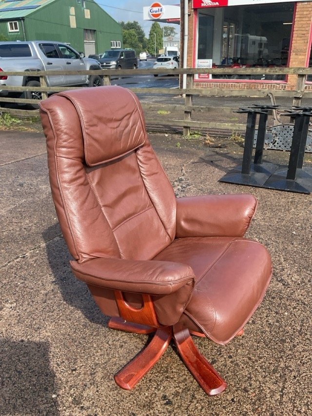 A leather upholstered recliner armchair with tapering rectangular back and seat flanked by outscrolled arms swivelling on a base with five outswept hardwood feet.