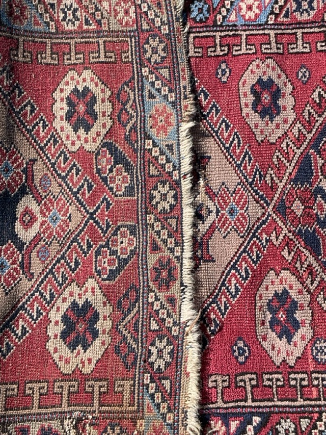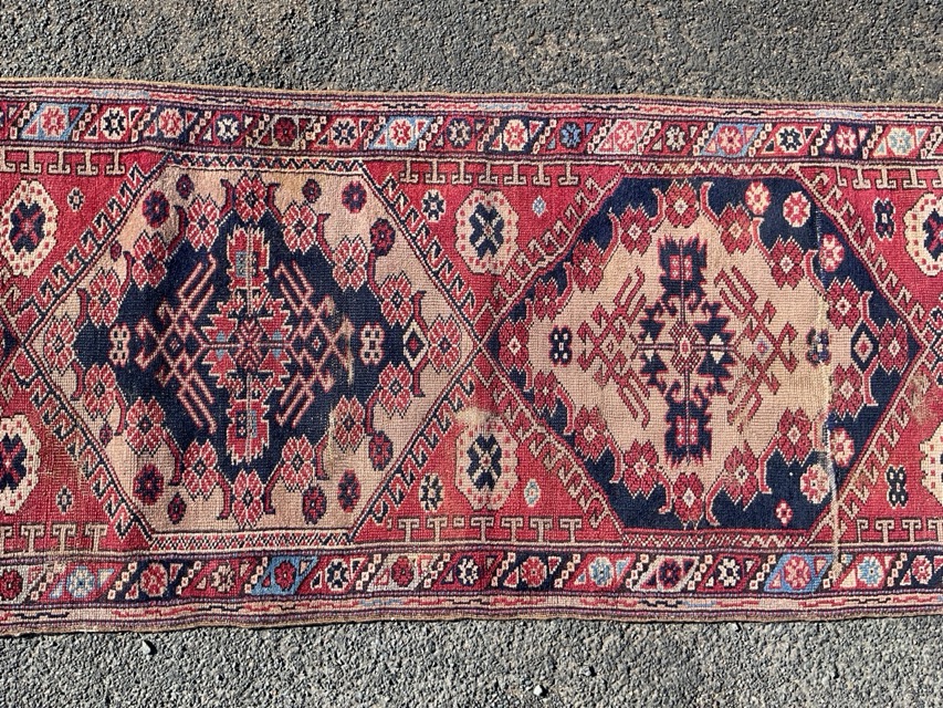 A Persian Heriz wool runner woven with six hexagonal medallions amid gul motifs on a red field, within floral borders. (31.75in x 177in)