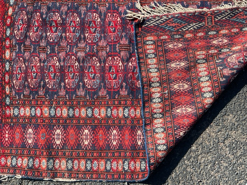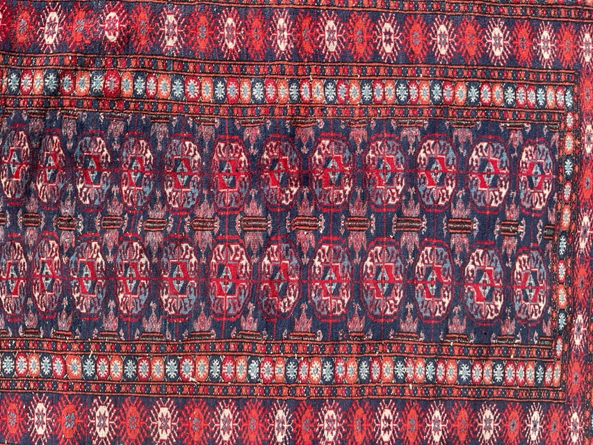A Turkoman wool rug woven with two rows of gul motifs on a dark blue field, within multiple flowerhead borders. (35in x 48in)