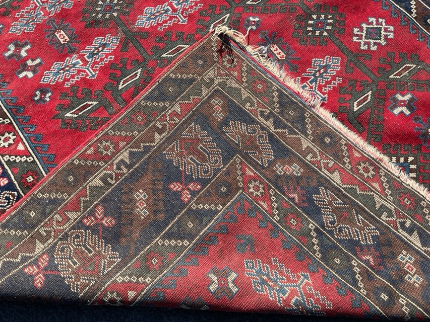 A Turkish Dosemealti wool carpet woven with plant motifs on a red field within meandering foliate and flowerhead borders. (78.75in x 114in)