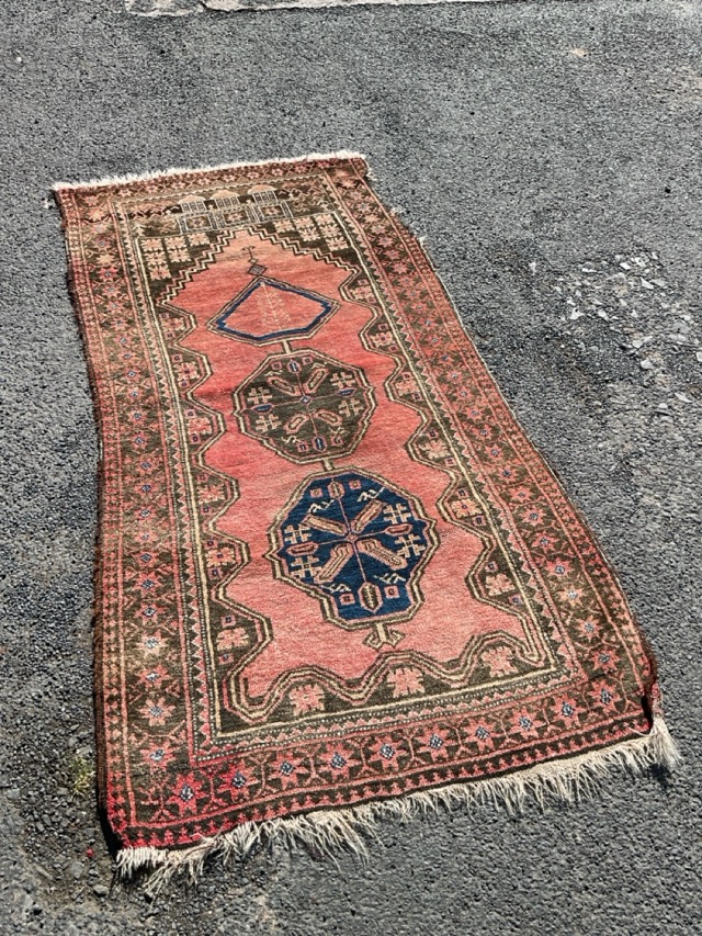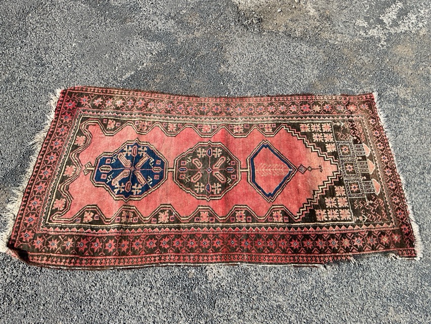 A Bokhara wool prayer rug woven with two hexagonal medallions and a stylised lantern motif in a mihrab with red field, framed by stylised flowerhead, gul and geometric borders. (30in x 59in)