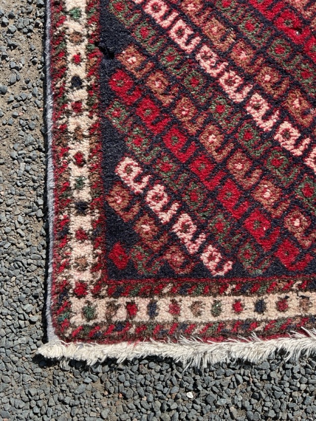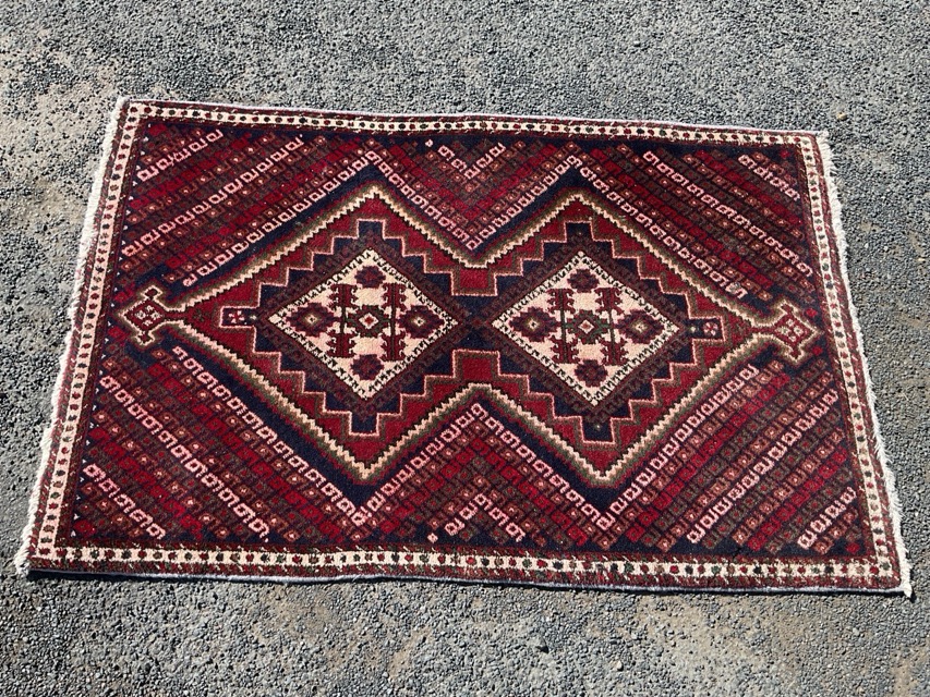 A Persian Shahbabak wool rug woven with two lozenge medallions on a dark blue field with diagonal lines of boteh motifs within geometric borders. (31in x 48in)