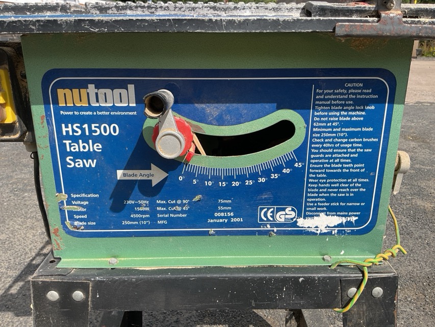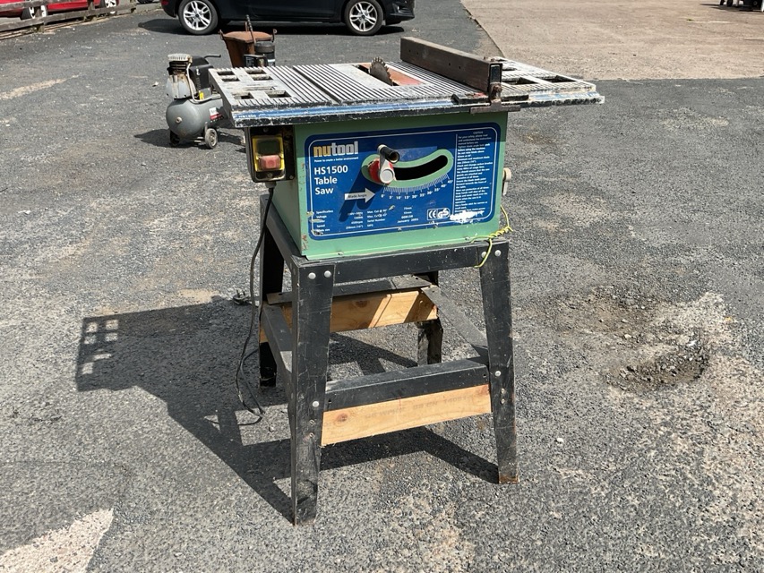 A Nutool table saw with 10in blade, having ribbed cutting table with guides and adjustable gradient, raised on stand with angled legs. (A/F)