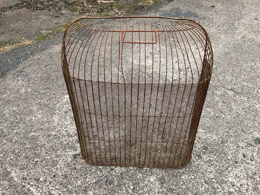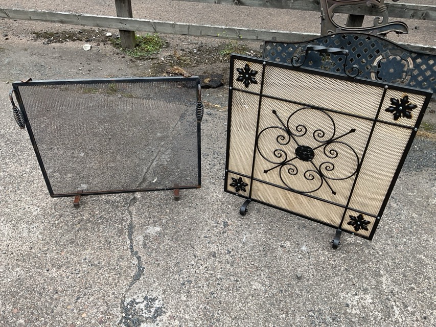 A square wrought iron wire mesh fireguard with ropetwist handle, central scroll motif and flowerhead corner mounts on scrolled feet; a rectangular mesh sparkguard with open spiral handles; and a domed topped wire cage fireguard. (3)