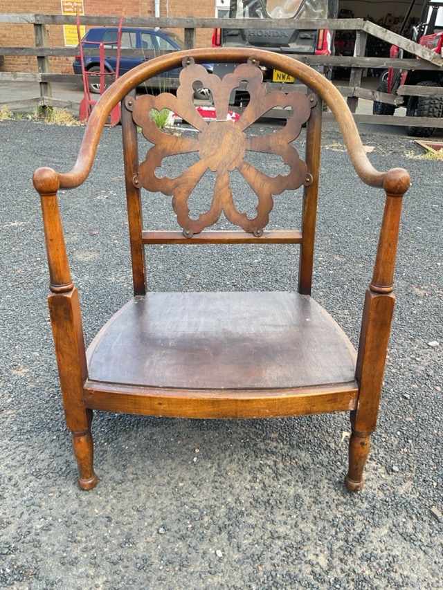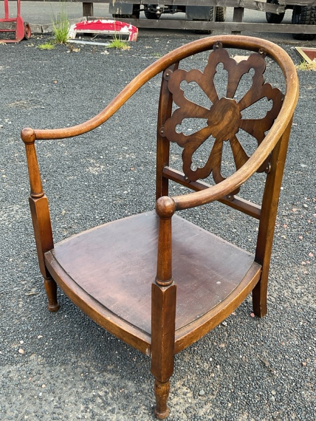 A 20s beech low armchair with arched horseshoe shaped back above a pierced rose window shaped splat, flanked by arms on turned supports with ball finials, raised on turned legs.