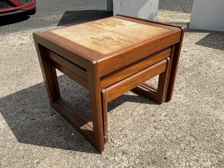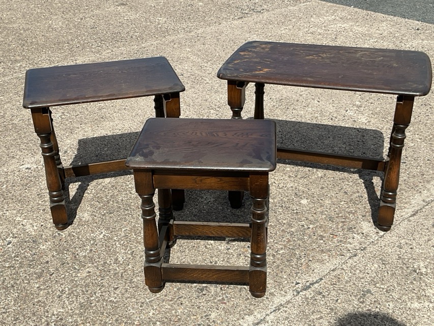 A Jacobean style oak nest of three tables with rounded rectangular tops raised on baluster turned legs joined by stretchers; and a 70s teak nest with rectangular tiled tops raised on rectangular legs. (2)
