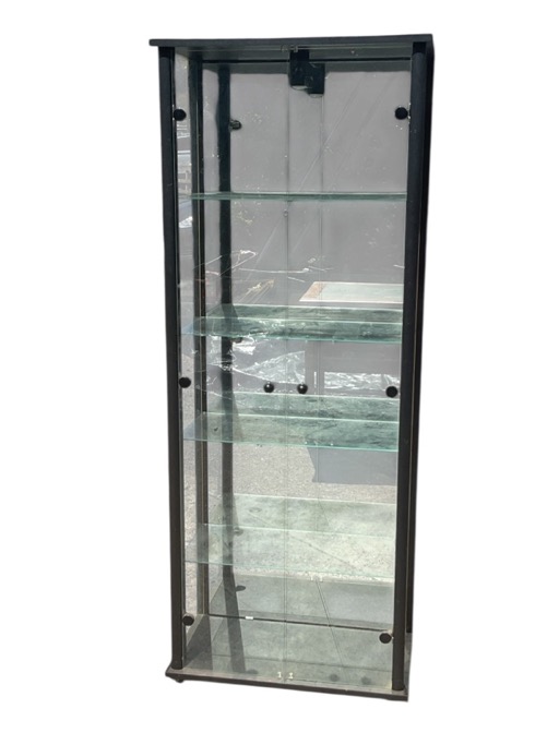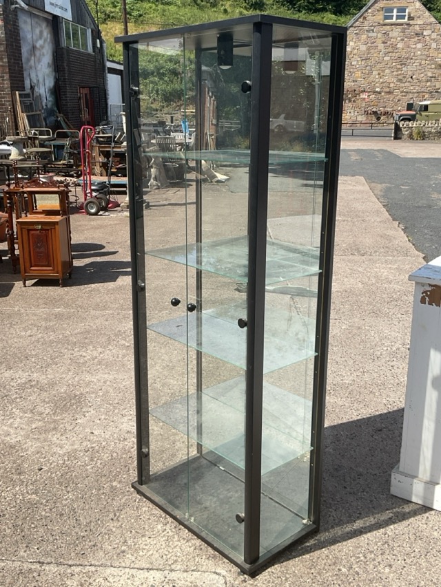 A contemporary metal framed display cabinet with and internal light above a pair of knobbed glass doors enclosing a mirror backed compartment with adjustable glass shelves. (29.5in x 13.5in x 67in)