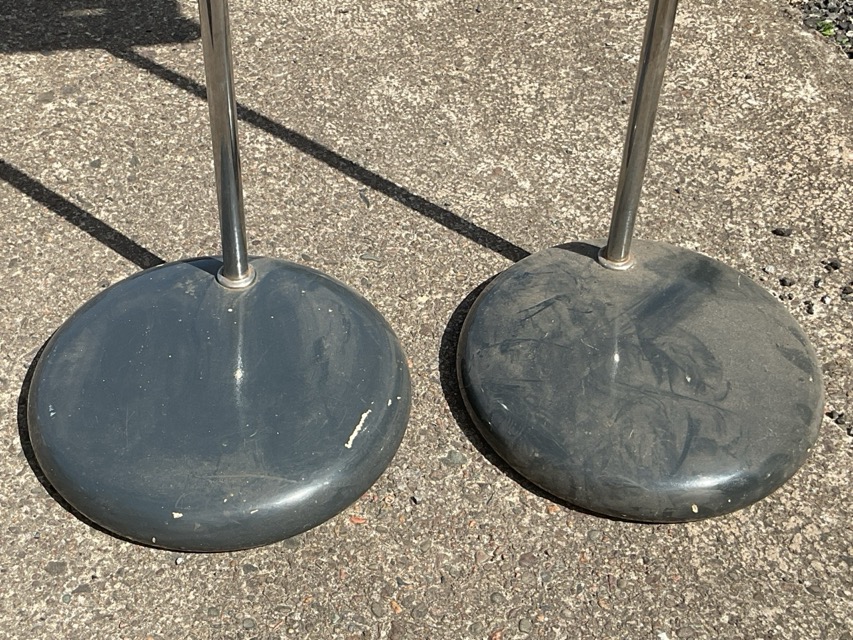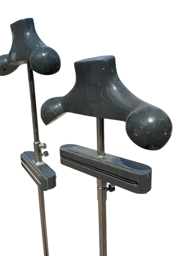 A pair of shop display stands with moulded necks and shoulders on adjustable chromed columns, with sprung skirt/trouser clamps on circular weighted bases. (2)