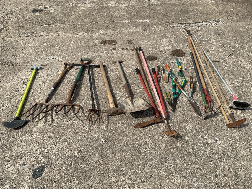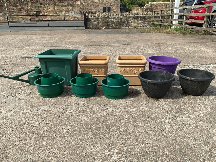 Miscellaneous garden tools – forks, hoes, shears, a shovel, edgers, a branch loper, a lump hammer, handtools, etc; and a quantity of plastic garden pots, buckets, a watering can, etc. (A lot)