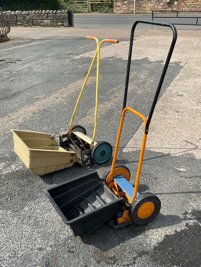 Two Ginge push-along garden lawnmowers with grass boxes; and two galvanised garden incinerators and covers. (4)