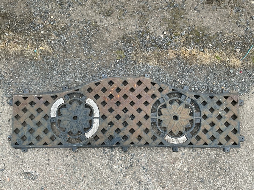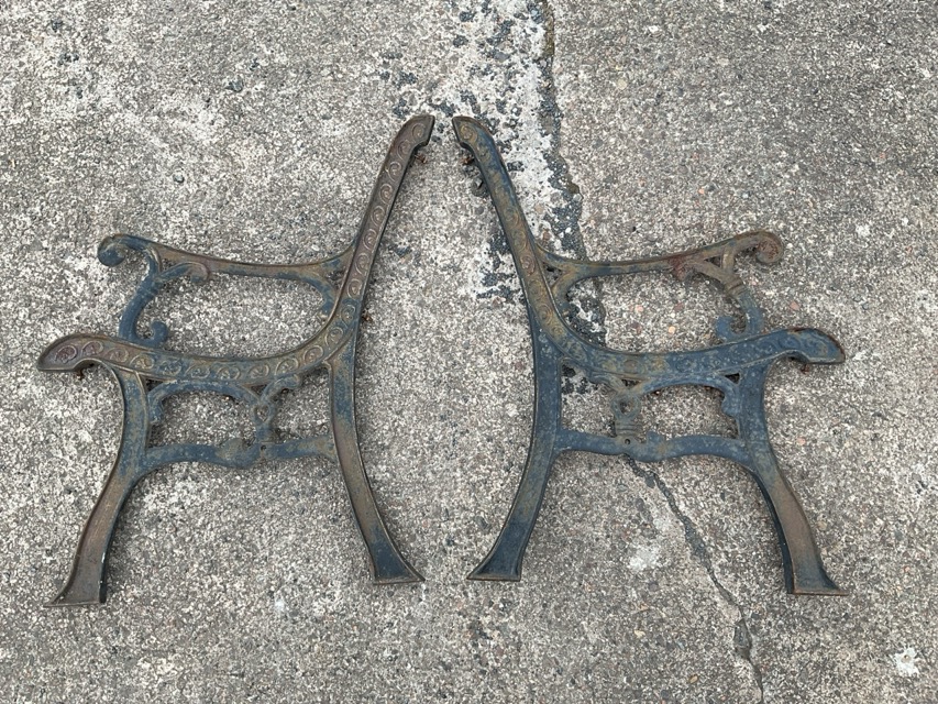 A dismantled cast iron garden bench with arched latticework back panel having two flowerhead medallions, on scrolled ends with tapering sabre legs. (A/F)