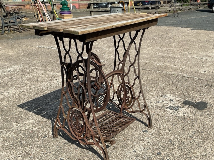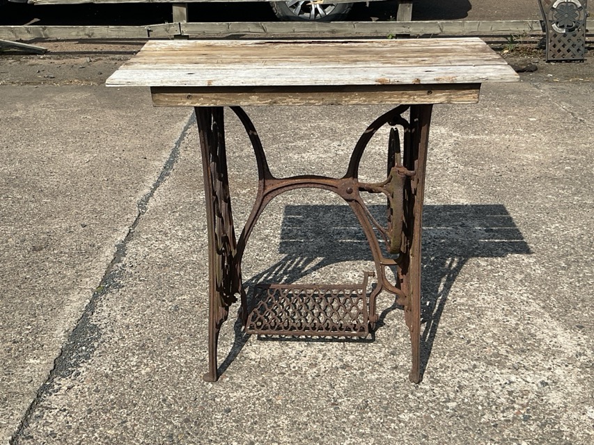 A garden table formed from an old cast iron Singer sewing machine table, with treadle mechanism and pierced latticework supports beneath slatted top. (34.25in x 16in x 30.5in)