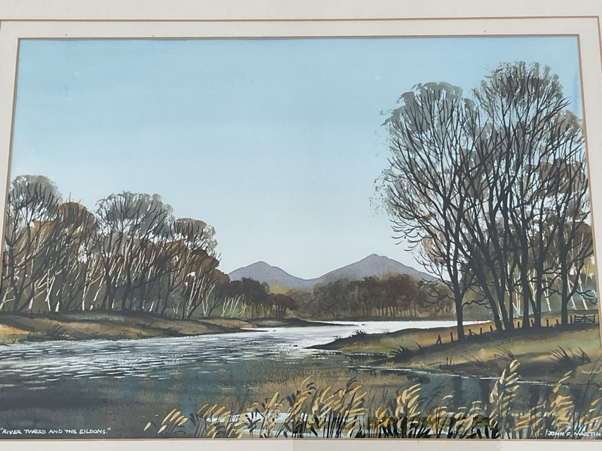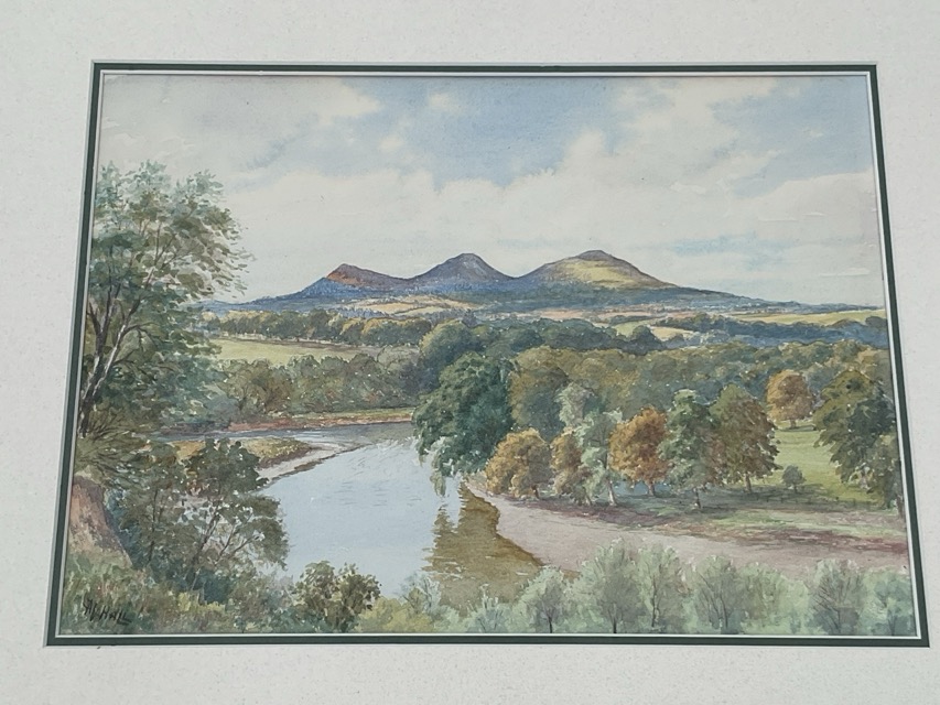John Martin, watercolour, Tweed river landscape titled River Tweed and the Eildons, signed, mounted & framed; and AV Hail, watercolour, Eildons river landscape, signed, mounted & framed. (2)