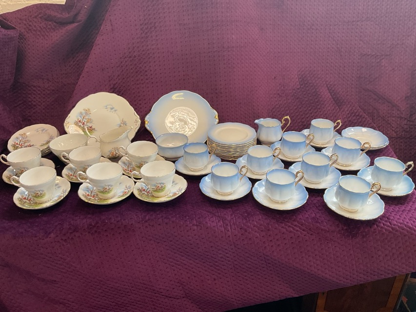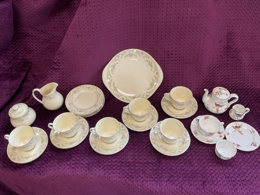 A Royal Doulton early morning teaset decorated with birds and floral sprigs - H1422; a Regency six-piece hunting teaset; a Royal Albert blue glazed ten-piece teaset; and a Royal Doulton six-piece set decorated in the Romance Diana pattern. (4)