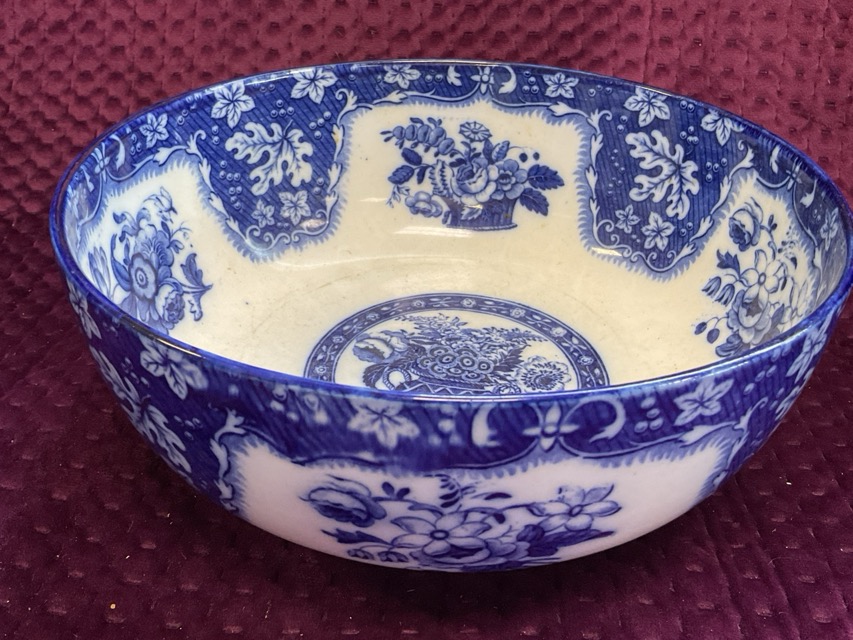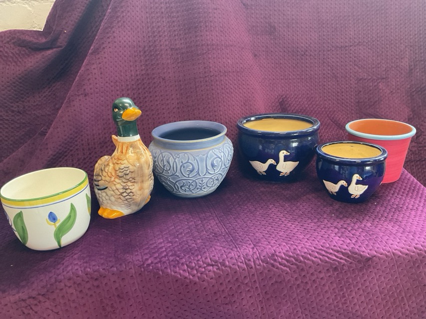 A Doulton blue & white bowl decorated with baskets of fruit; and miscellaneous jardinières, plant pots, etc. (A lot)