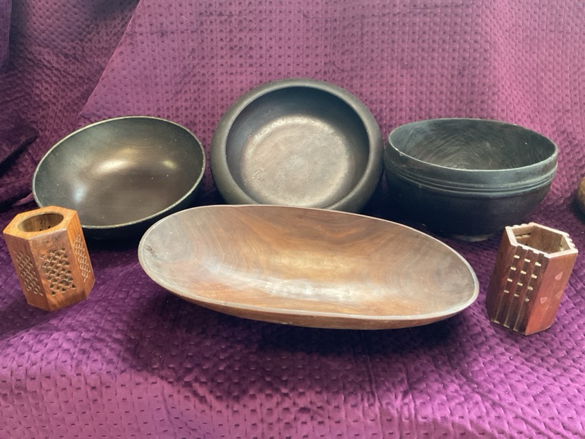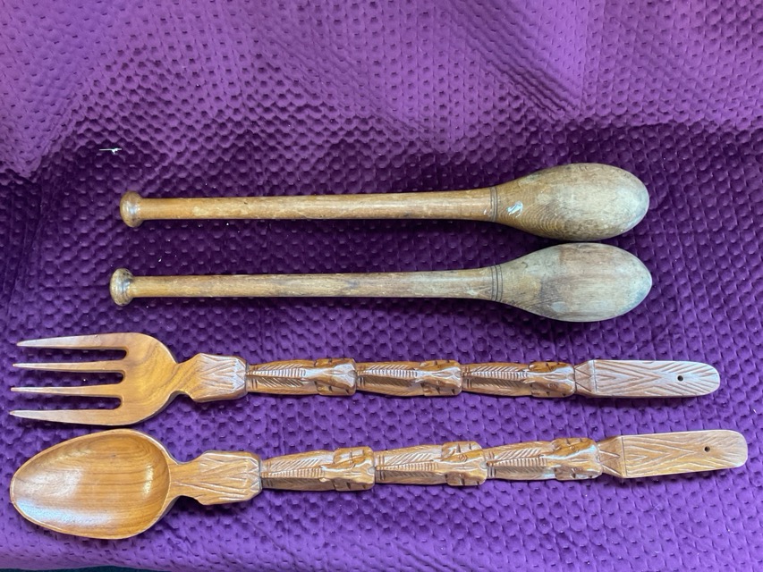 A pair of hardwood dumbbells; miscellaneous turned & carved hardwood bowls; and an giant African spoon & fork with elephant handles. (A lot)