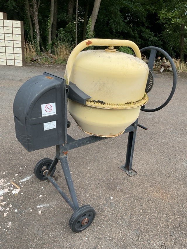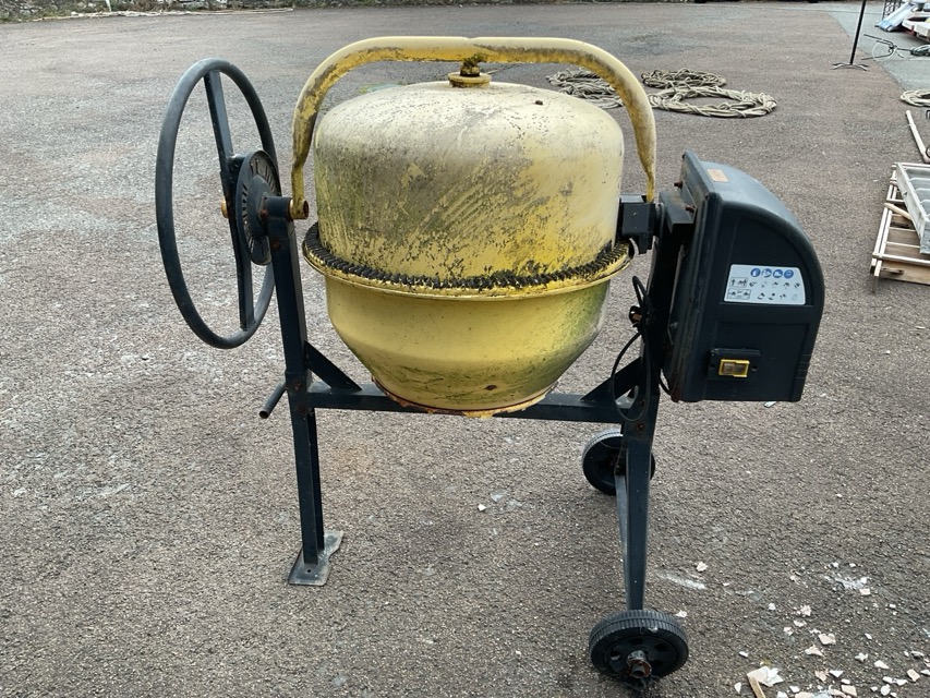 A knackered old electric cement mixer on trolley stand. (A/F) (23in x 42in x 49in)