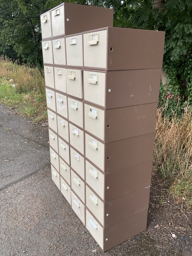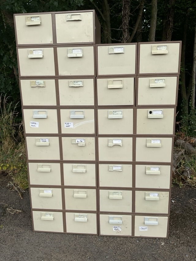 Thirty 7in filing drawers, made up out of thirteen twin and four single metal cabinets. (A lot)