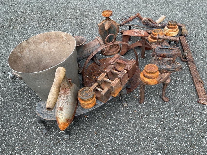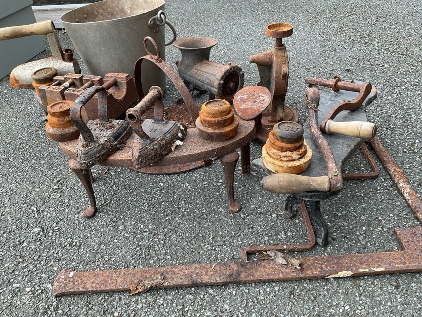 Miscellaneous old ironwork - cast iron weights, crank handles, a skillet, a coblers last, flat irons, fireside stands, Salters scales, a spit hinge, a mincer on stand, a bucket with swing handle, etc. (A lot)