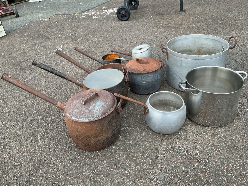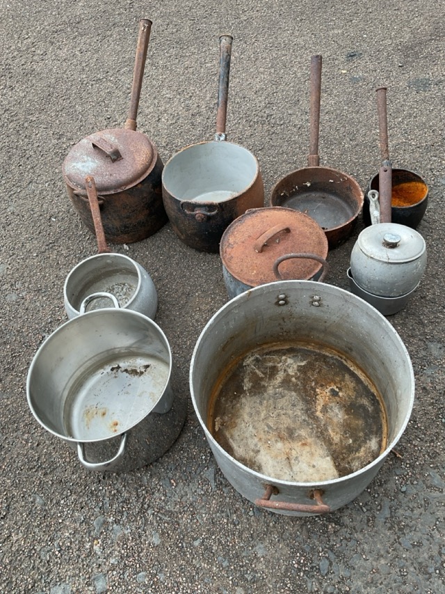 Ten miscellaneous old saucepans - cast iron, aluminium, some with covers, one stainless, cauldron type, etc. (10)
