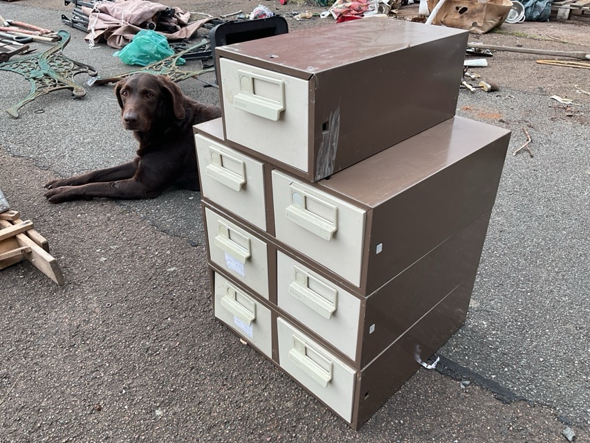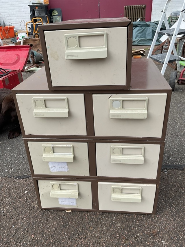 Seven Bisley 5in filing type metal drawers, two in twin cabinets and one single.