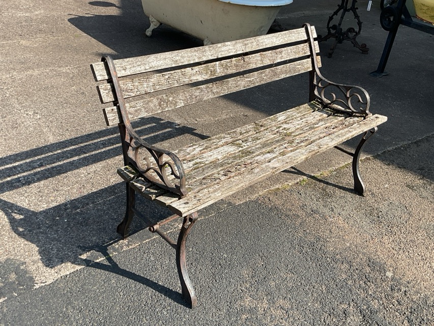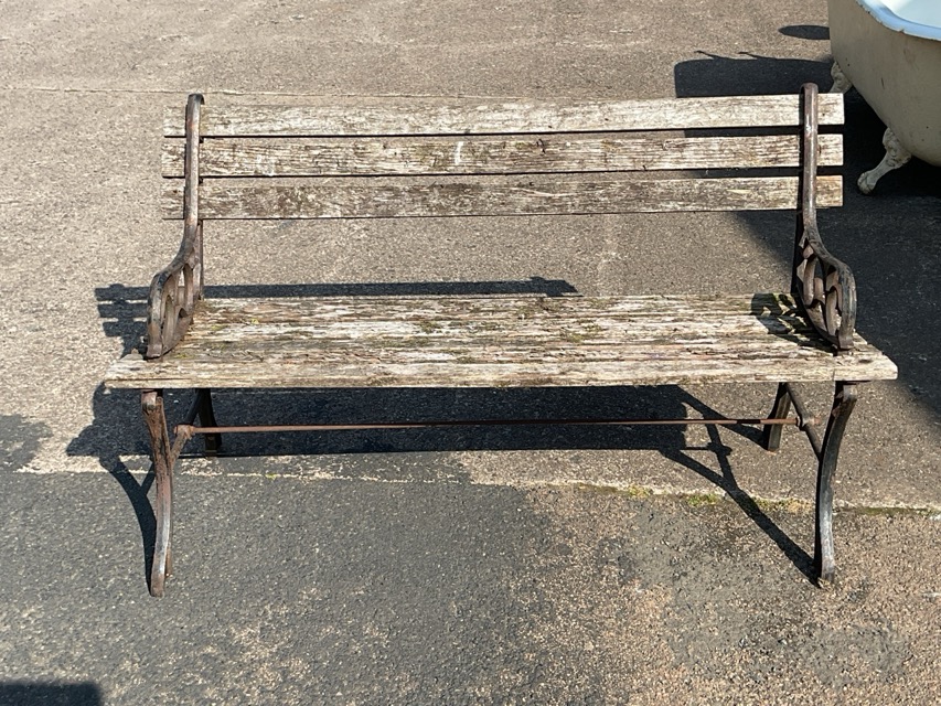 A four-foot cast iron garden bench with teak slats, having scrolled arms and channelled legs joined by rod stretcher. (48in)