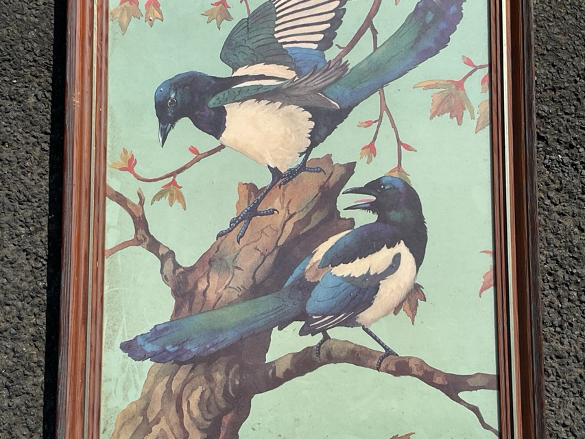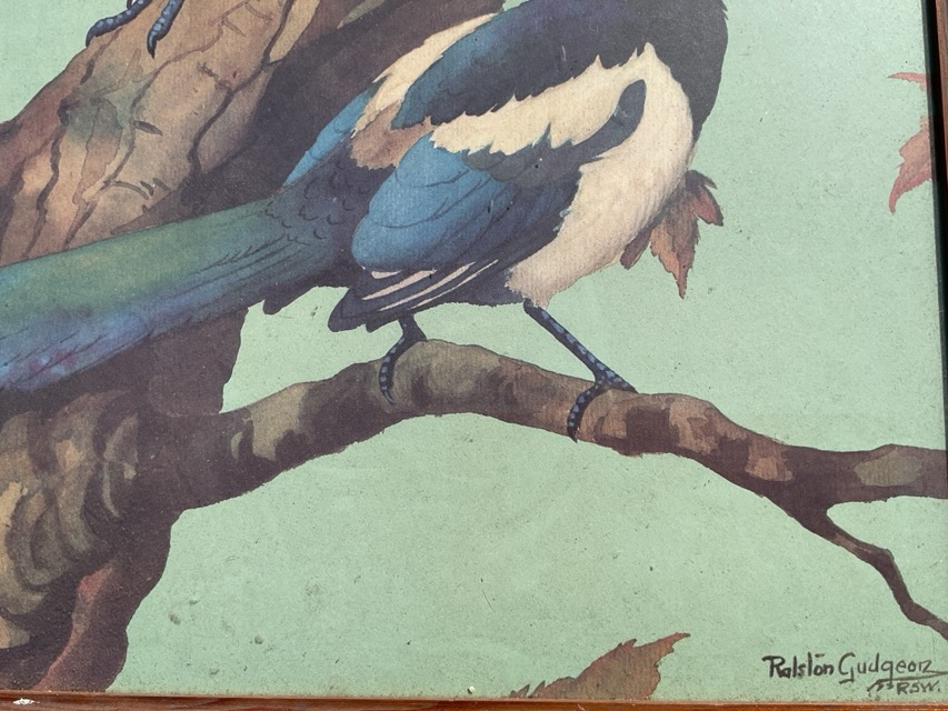 Ralston Gudgeon, coloured print with pair of magpies on branch, signed in the print, framed. (15.5in x 19.5in)