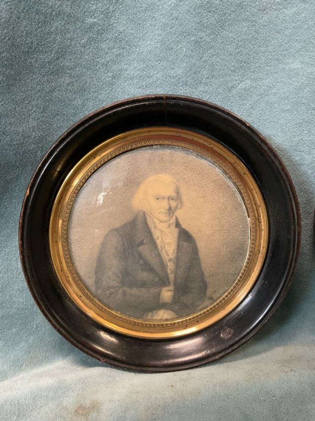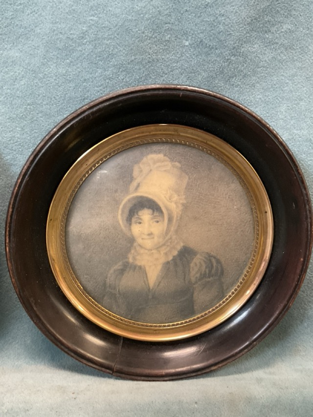 Circular C19th pencil portraits, a pair, busts of a Victorian lady & gentleman, in ebonised moulded frames with gilt metal slips. (3.75in) (2)