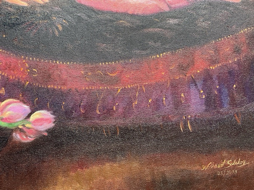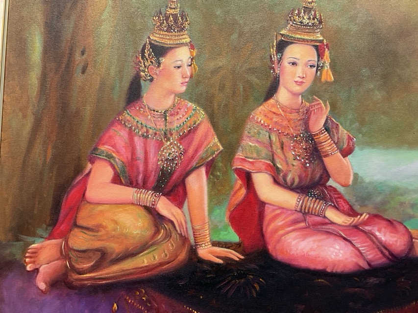 Brauat Solatoy? Thai school, oil on canvas, two young maidens seated on cushion in traditional robes, signed, dated & framed. (31in x 39in)