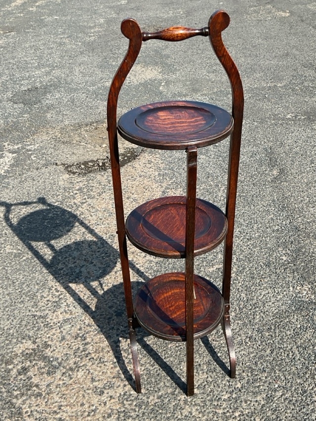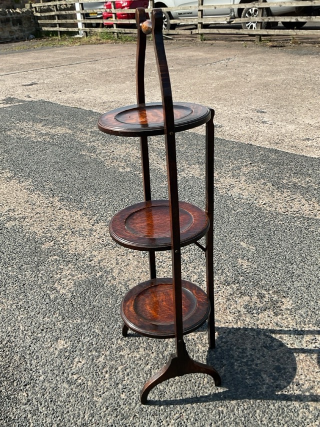 A folding Edwardian oak cakestand with three circular saucer shaped platforms on square supports beneath a turned handle. (35.5in)