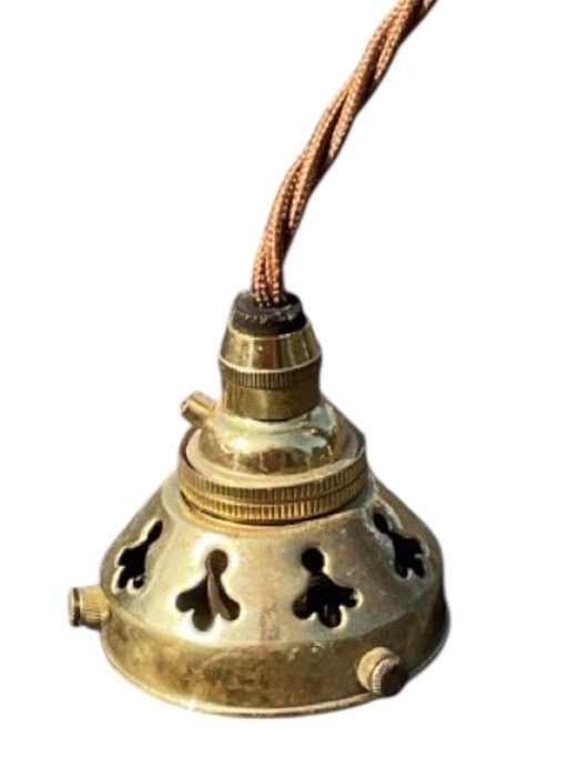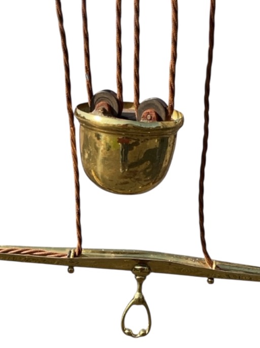 A Victorian brass rise-and-fall light fitting, with pull-down bar supporting twin lampholders on pulley wheels with basin shaped weight.