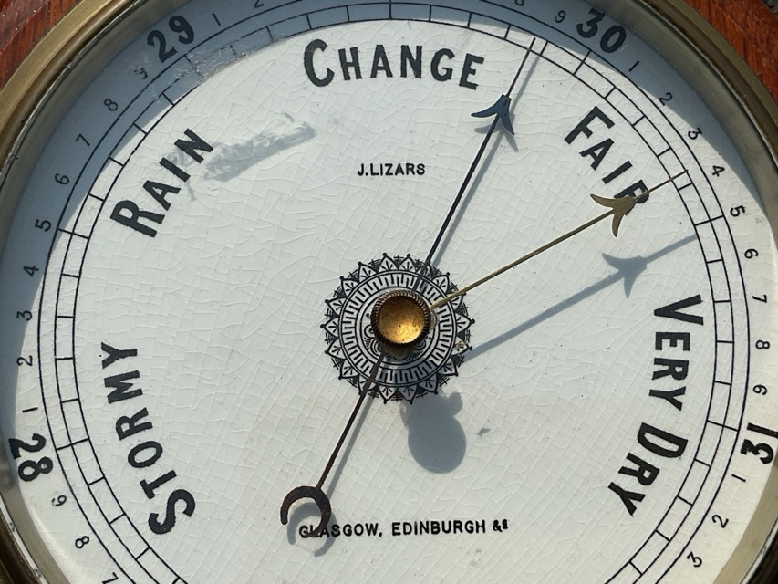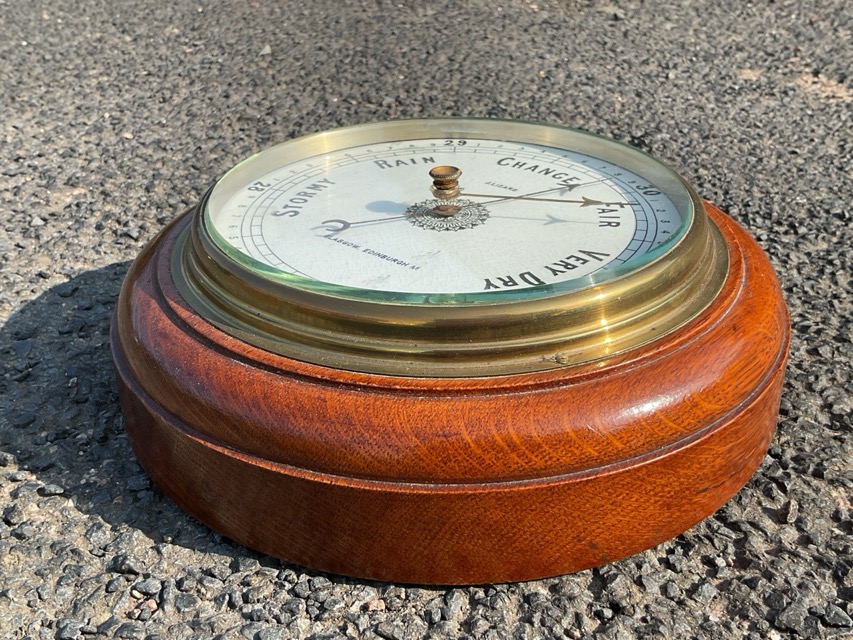 A circular Edwardian aneroid barometer by J Lizars of Glasgow & Edinburgh, the enamelled dial under bevelled glass with brass bezel, on moulded oak panel. (9in)
