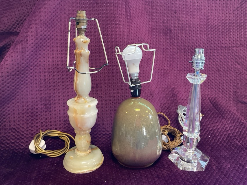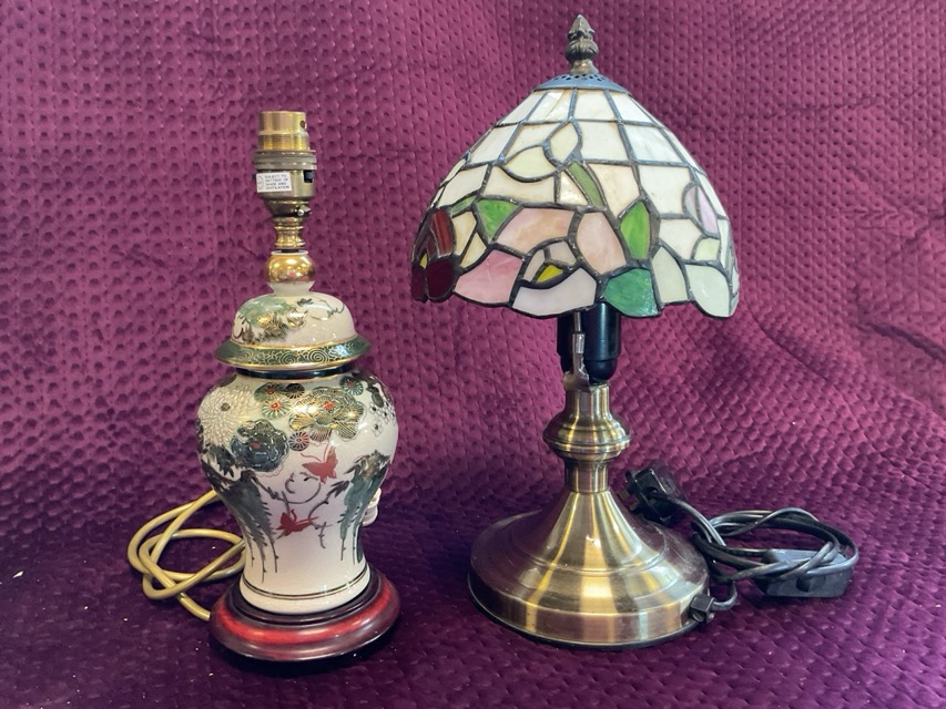 Five tablelamps - Royal Lancastrian lustre glazed, onyx, octagonal glass, Satsuma ginger jar & cover type, and metal with leaded glass shade. (5)