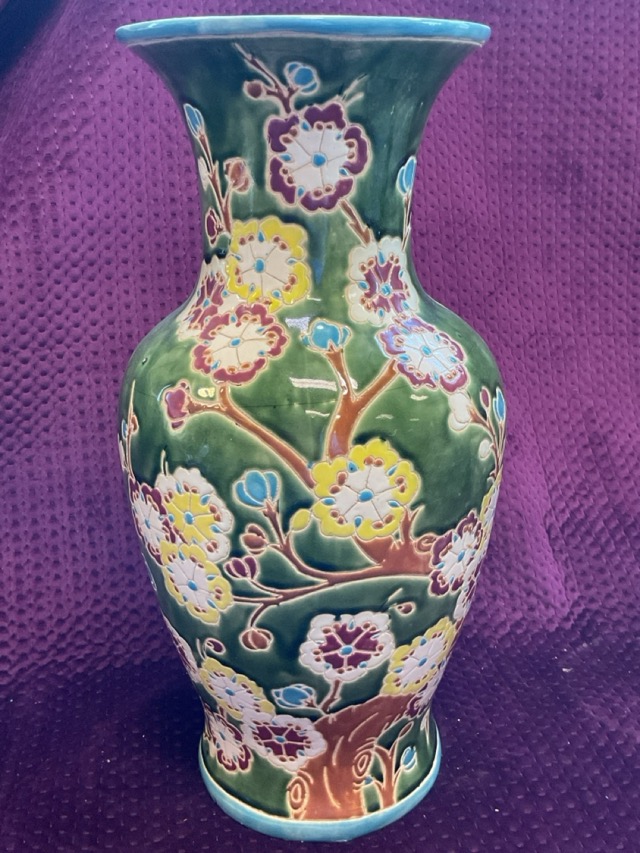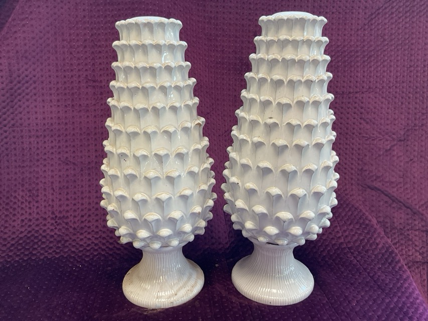 A pair of decorative Italian white glazed terracotta tablelamps of pineapple form on waisted fluted bases; and a large stoneware baluster vase decorated with chinoiserie flowers on green ground. (20.5in) (2)