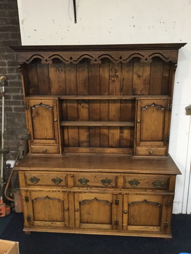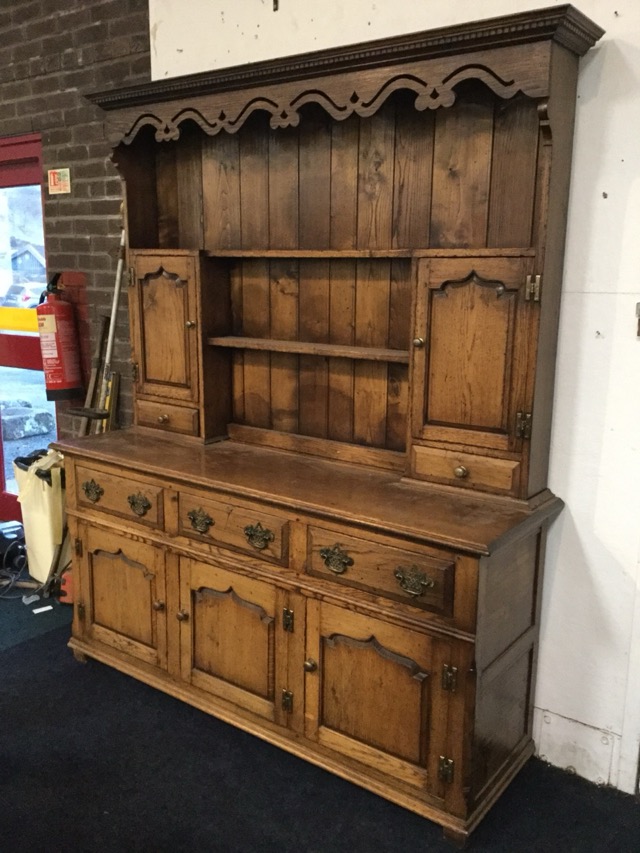 A Georgian style oak dresser, the delft rack with dentil cornice above a pierced waved apron, having tongue & groove boarded back and open shelves framed by small gothic shaped cupboards and drawers, the base with three frieze drawers above fielded panelled cupboards. (66in x 20in x 80in)