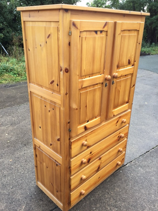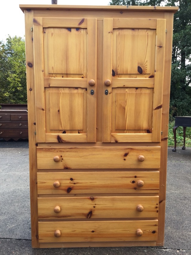 A reproduction pine press cupboard, the top with fielded panelled chamfered doors above four long knobbed drawers. (44in x 21.25in x 72in)