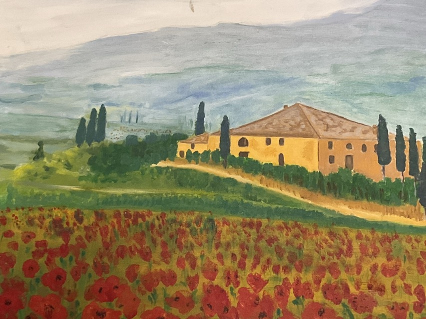 Judy Kyle, oil on canvas, Italian landscape with villa, titled Tuscan Retreat to verso, signed and gilt framed; and Henry Scott Tuke, coloured print, TE Lawrence as a cadet on Newporth Beach, signed in the print, and gilt framed. (2)
