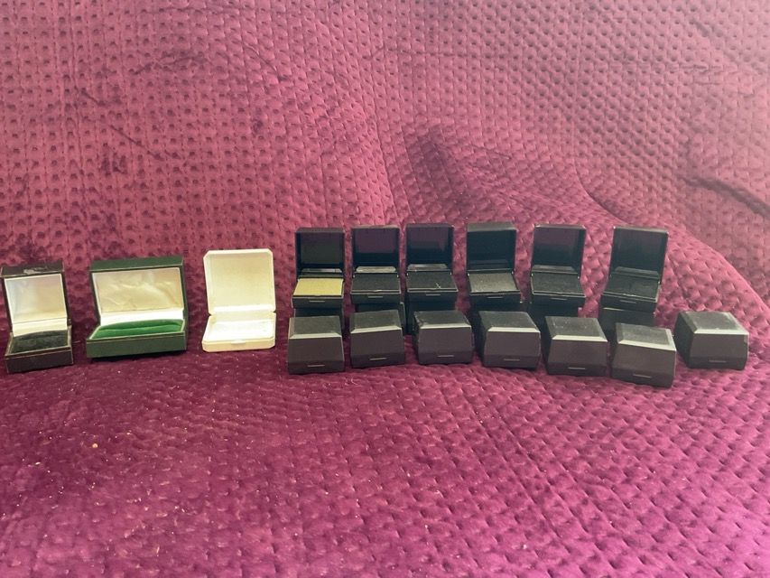 Nineteen black ring boxes, an earring box, a leather ring box, and a leather brooch box. (22)